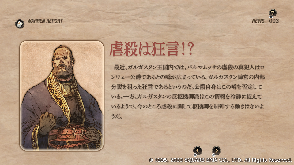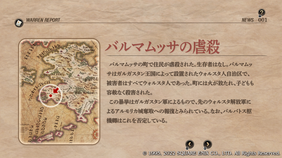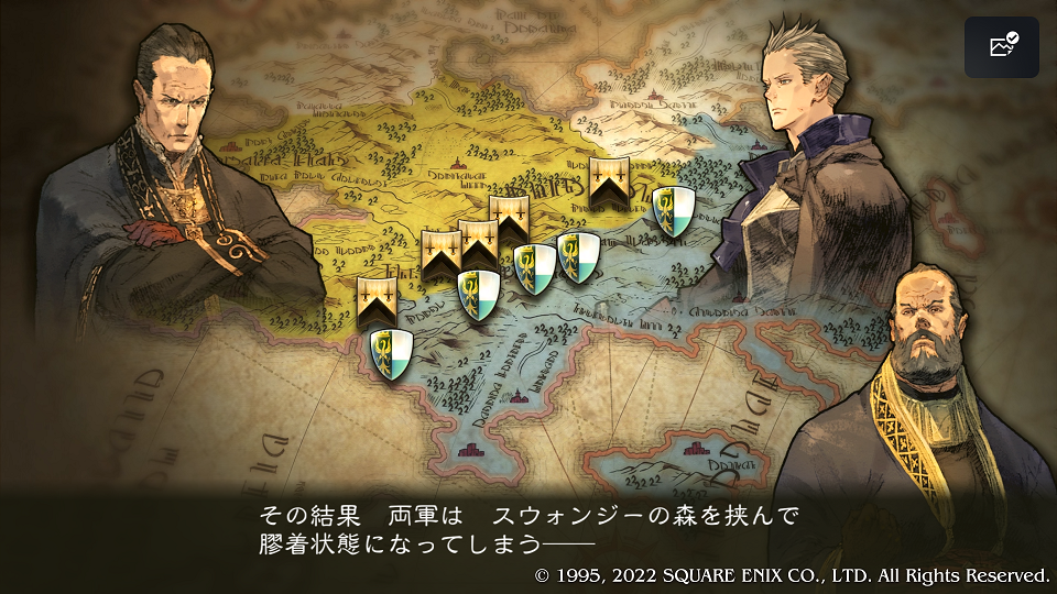 運命の選択を終え、第二章突入。Lawルートは株式会社ロンウェーの平社員?いや課長くらいかもしれないルートとなる。バルマムッサの大虐殺から3週間、アルモニカに戻ってウォルスタ・ガルガスタン両陣営の現状把握。兵力差は圧倒的不利、ウォルスタは一致団結の雰囲気だが、大虐殺を以てしてもガルガスタンを内部分裂させるまでには至らなかった。
