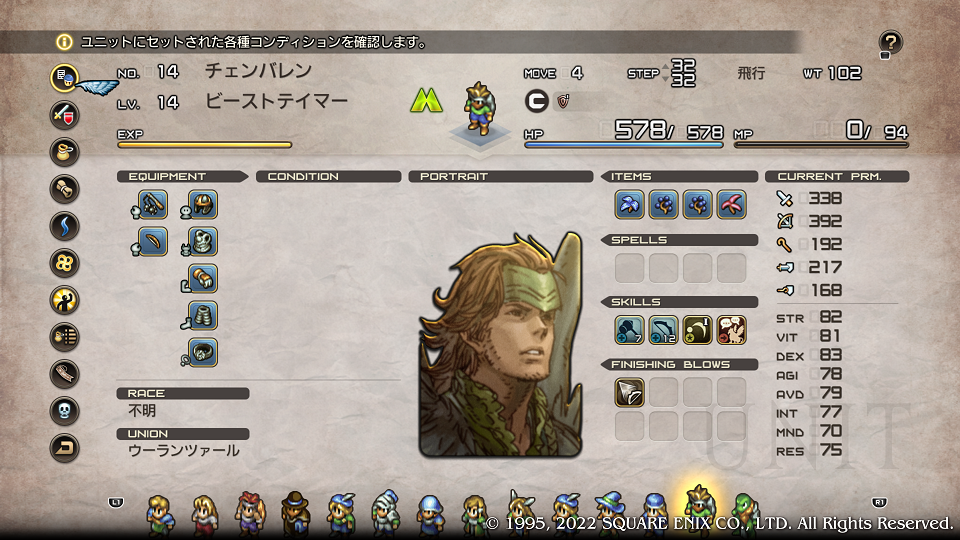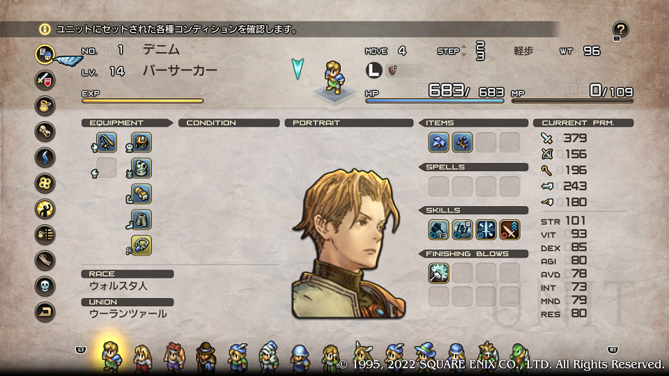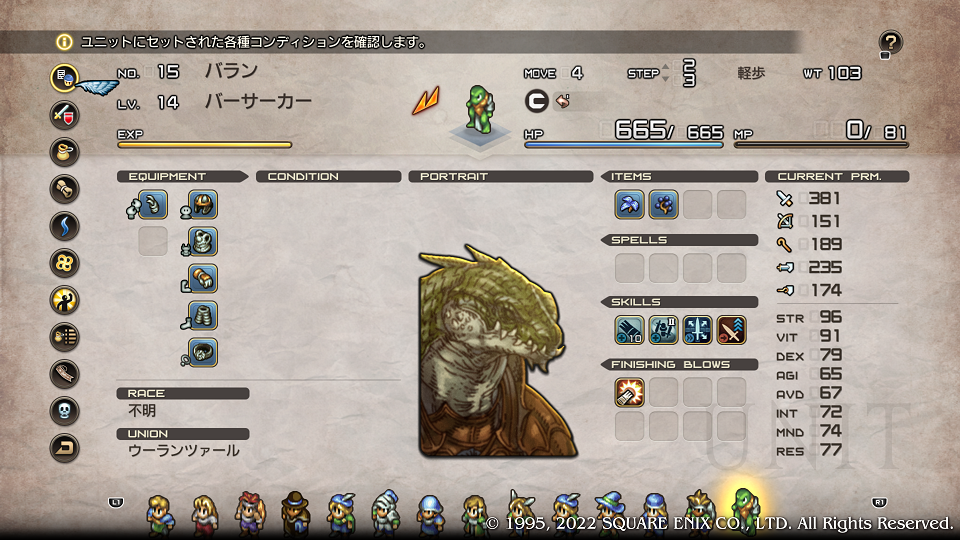 そして驚いているのがリザードマンだ。なかなかに強キャラ、デニムに届こうかというほどのステータス。汎用にしては素晴らしいと個人的に思っている。格闘武器でようやく必殺技も覚えたのでレギュラー決定か、しかしこれからは色んなシチュエーションが増えてくるからなベンチに入ることもあるだろうが頑張ってほしい。サッカーワールドカップ日本代表にもがんばってほしい。