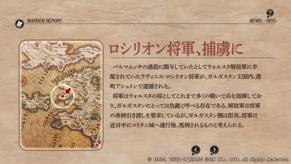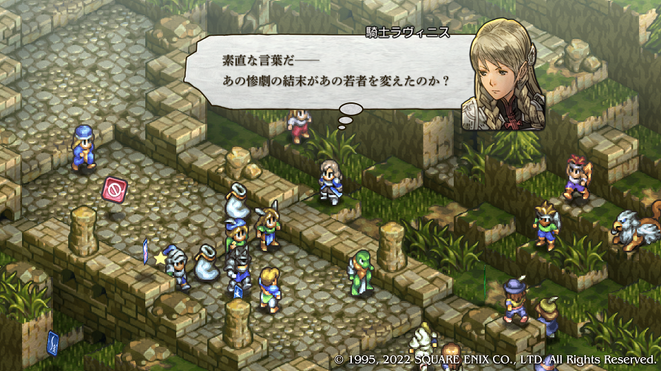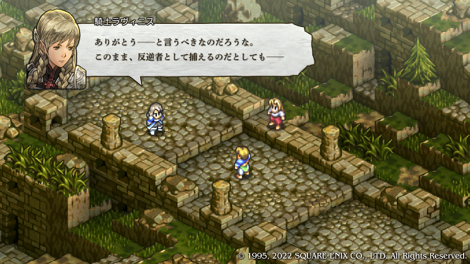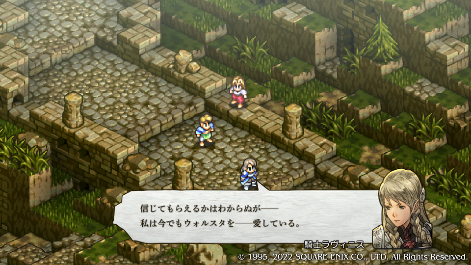 Lルートを選んだ場合にいきなり誰が分かるんかいと当時震えまくった。もうとっくにシナリオ通り過ぎててエルピー・プル並みにプルプルしたのは20代の時だった。ちなみにエルピープルはプルプル言うがプルプルしてはいない、はい。そう、タクティクスのアグリアス的存在・本当のオレの姉さん(?)ラヴィニスの加入フラグイベントである。「だからウォーレンレポートと日経新聞は読んどけって言ったんだ。」と若かりし頃の自分に言いたい。クリア後に戻って仲間にしたがLルートを軽く二週することになり、はがゆい思いをしたのだった。前作ではとにかく強かった、ずっとレギュラーだったので今回も是非その強さにあやかりたい。