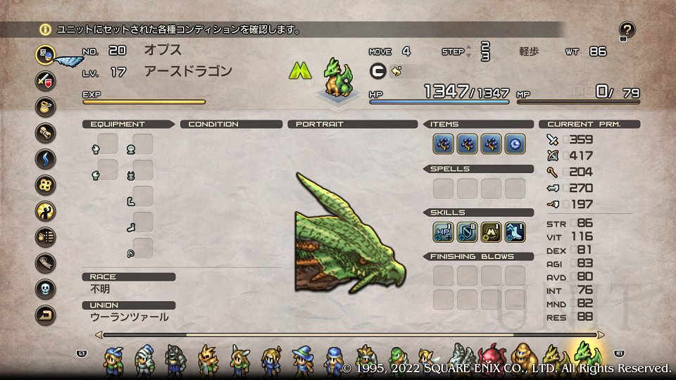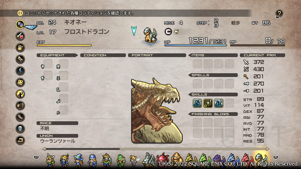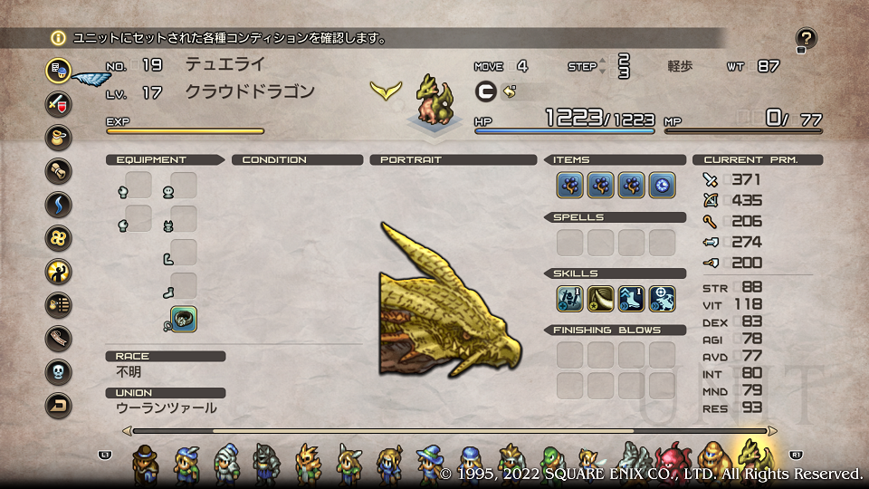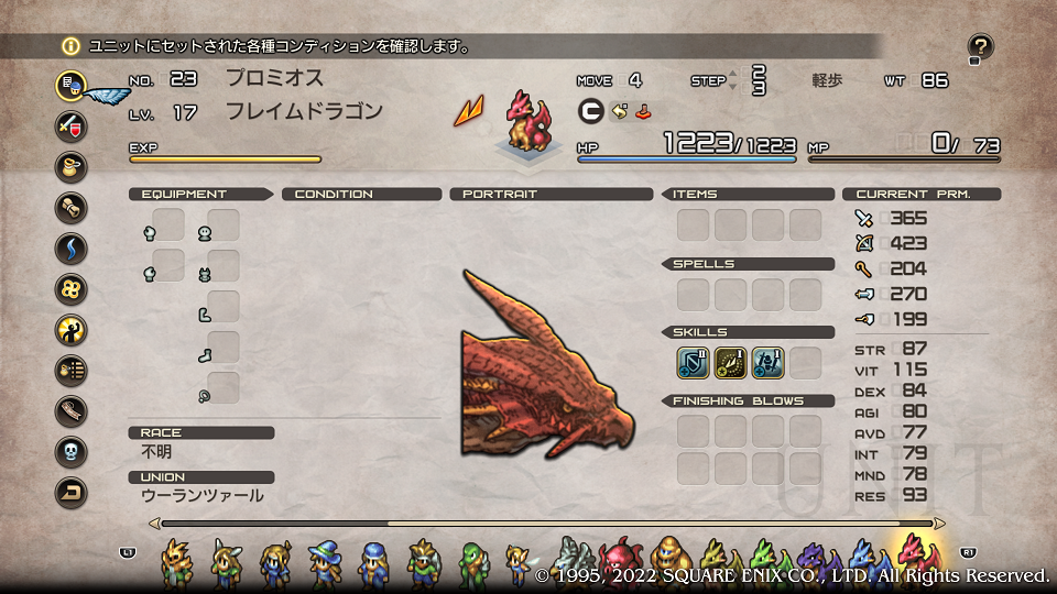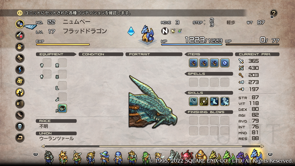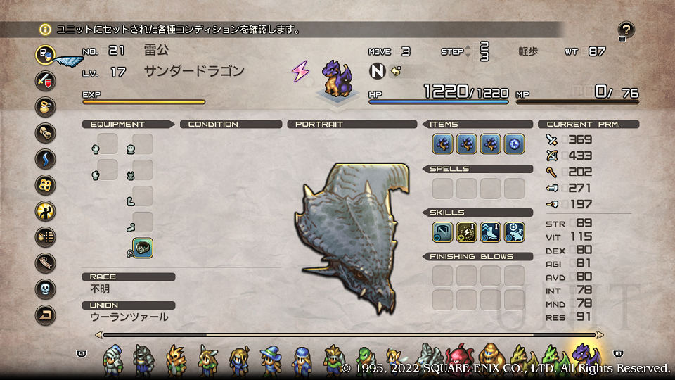 これでやっとドラゴン6種が出揃った、何日もかけて揃える必要は全く無かったが今回のタクティクスオウガは個人的に「楽しむ」ことをメインの目的にしているので、ストーリー進捗時点で出来ること·やりたいことは全部やるのだ。くわえて平日はプレイ時間が1時間、ブログ1時間と投下時間が短いので鈍足だが、その重い一歩がまた楽しい。進行速度を気にせずゲームをするのは久しぶり、子供のころ以来だろうか、満足度は上がる一方なので自分でも驚いている。