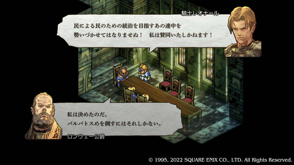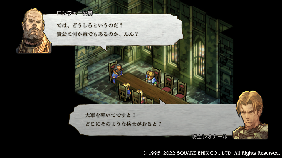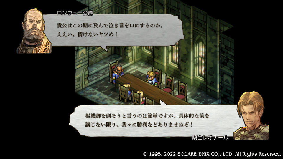 なんと功をあせってスウォンジーで敗戦を喫した公爵は性懲りも無くまたガルガスタンに全力タックルするつもりでいたのだ。レオナールパイセンはこれを必死に止めようとするが、話をまともに聞かない公爵はレオナールを部屋から叩き出してしまう。