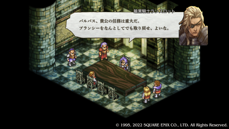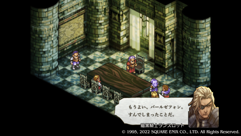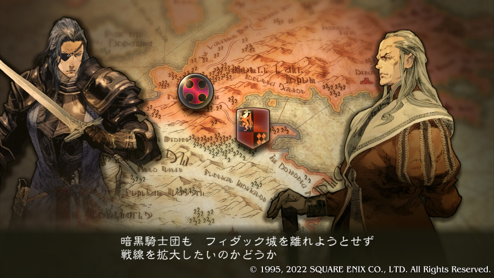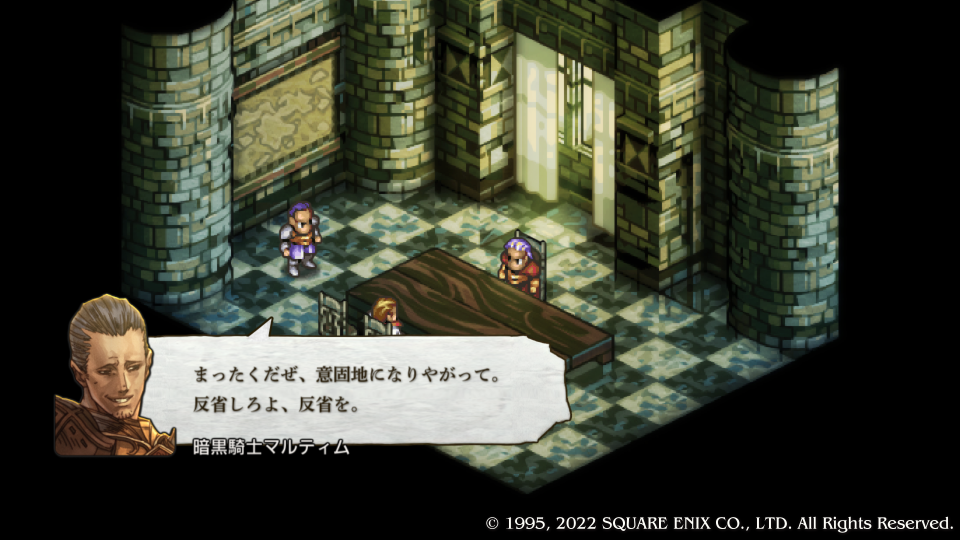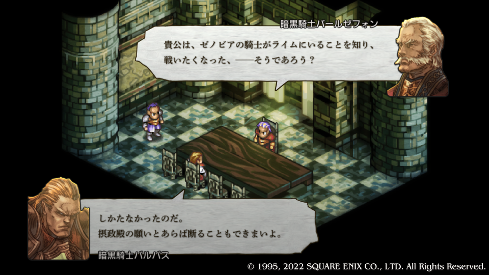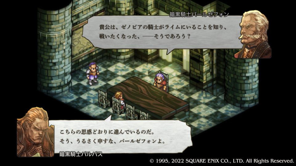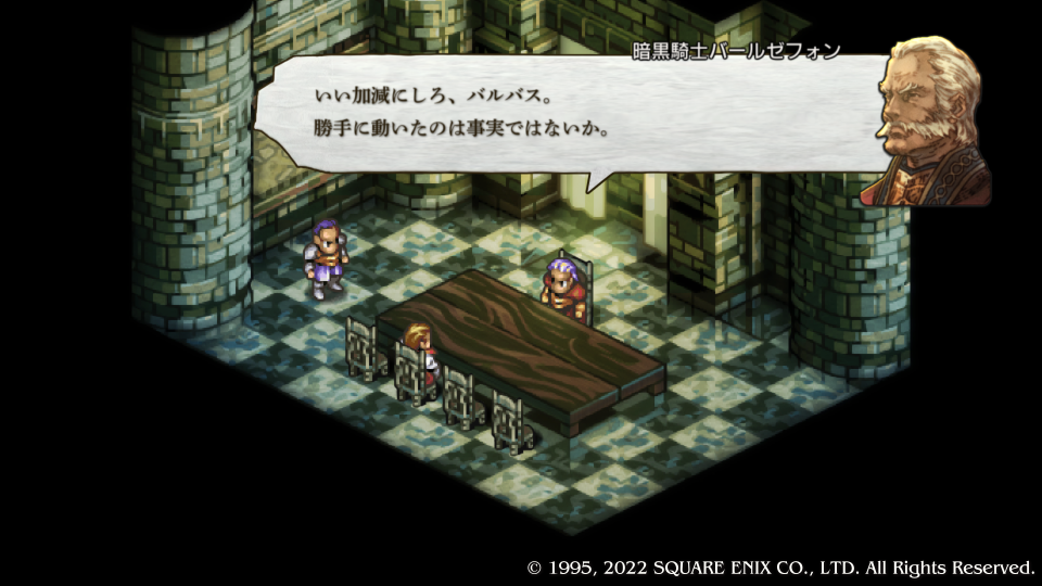 暗黒騎士団実質ナンバー2の『バールゼフォン・ヴァン・ラームズ』から怒られる『バルバス・ダド・グース』、やっぱりこいつが勝手に侵攻したんだった。『マルティム・ノウマス』が調子に乗って何か言ってるがバールゼフォンから注意される。自分の復習のために人物をフルネームで書いたり解説を入れたりしている、勉強しながらやればさらに楽しいタクティクスオウガリボーン。