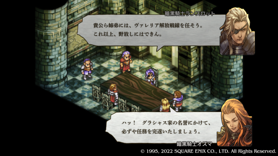 ヴァレリア解放戦線はスーパー二卵性双生児の姉『オズマ・モー・グラシャス』と弟『オズ・モー・グラシャス』に任せるというランスロット。野放しにできないとはホント物騒だなこの人たち、そしてそれぞれの任務に就く暗黒騎士団のテンプルコマンドたち、ヴァレリアで何か大いなる野望を遂げようとする暗黒騎士団も本格参戦して三章はガルガスタン軍・暗黒騎士団とカオス激戦になること間違いない。マジ卍こわい。