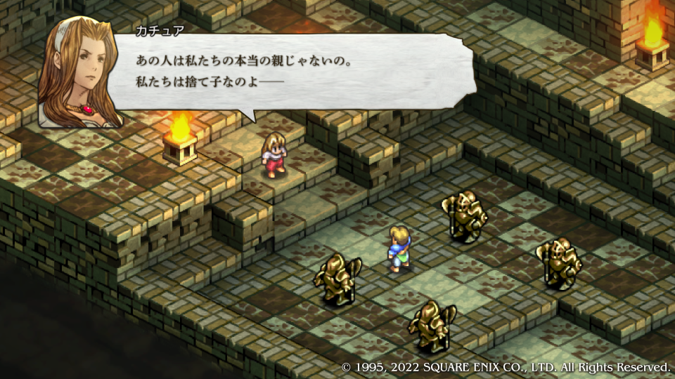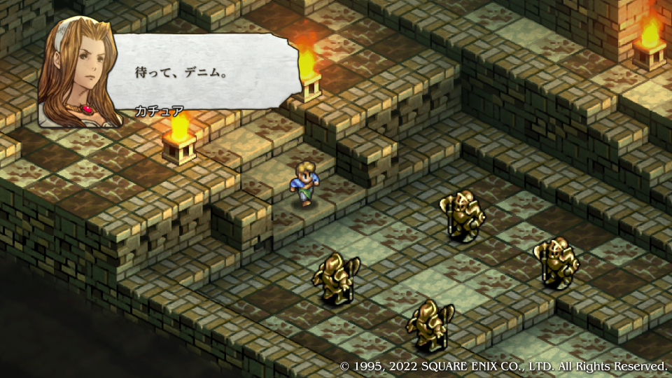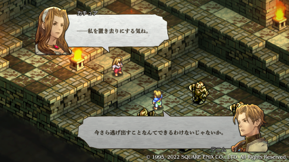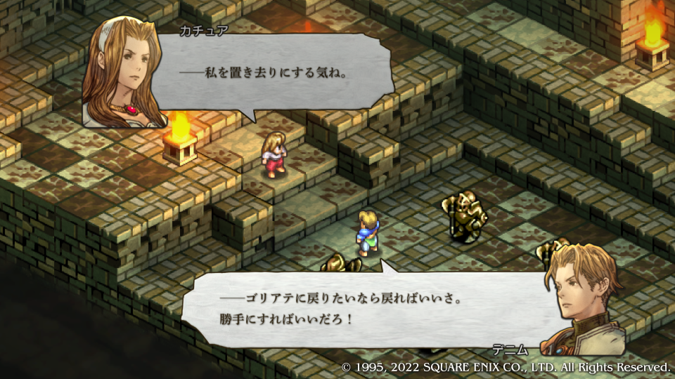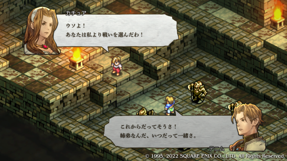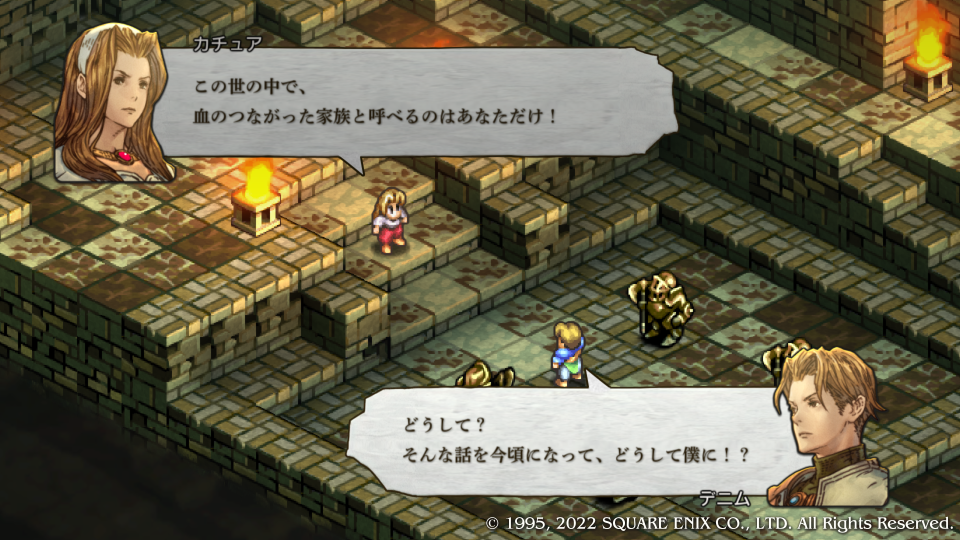 デニムはいつだって姉さんと一緒だと応戦するも『ウソよ!』といって一蹴、いつも気丈な振る舞いをしているがデニムにはここ一番の溺愛ぶりを見せる。争いそのものを嫌悪するその姿勢は、客観的な現状を見たうえで避けられないことなのに、他の人間を捨てて自分たちだけでも争いから遠ざかろうとするほどだ。これはまさに異常なほどの嫌悪である。何がカチュア姉さんにそうさせるのか、その真意は、それとも何の背景がそうさせているのか、考察するヒマは今は無いので先に進む。これを最後にカチュアは一旦戦線を離脱することになる。