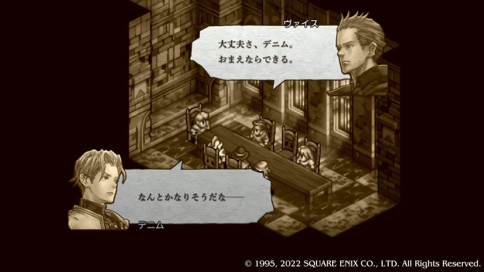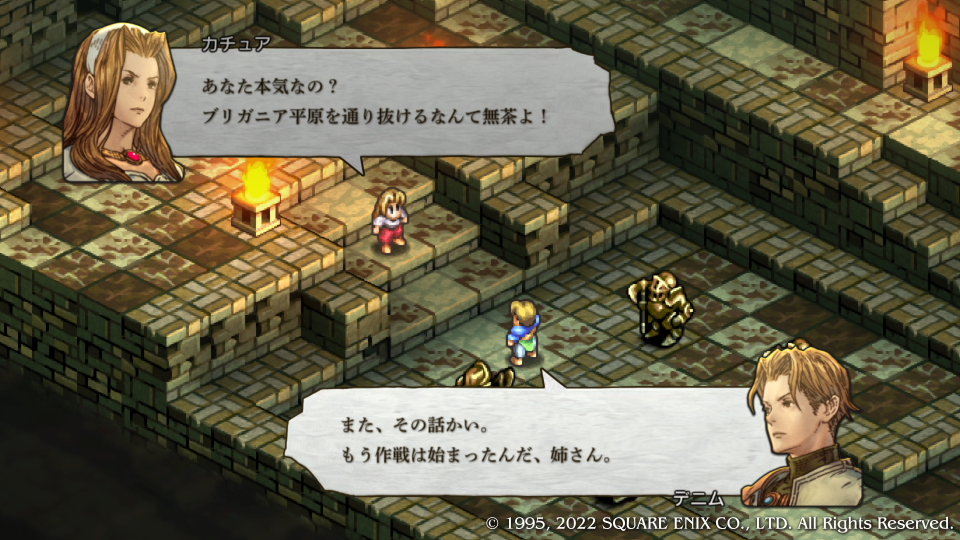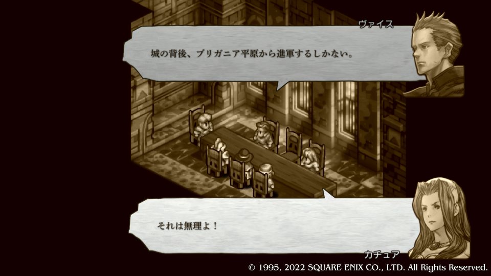 カチュア姉さんがめっちゃ否定するがデニムとヴァイスは結構無視して話を進めていき、ヴァイスがスウォンジーに向かってなんとか耐えてる間にデニムが通常では進軍不可能な雪原を強行軍で進軍、そしてコリタニ城にたどり着き枢機卿を討つという超リスキーな作戦を取ることになる。若くて勢いのある二人だから何とかなるよ、姉さん安心して。と言っても姉さんは許しちゃくれない。