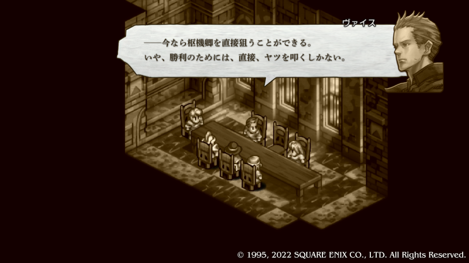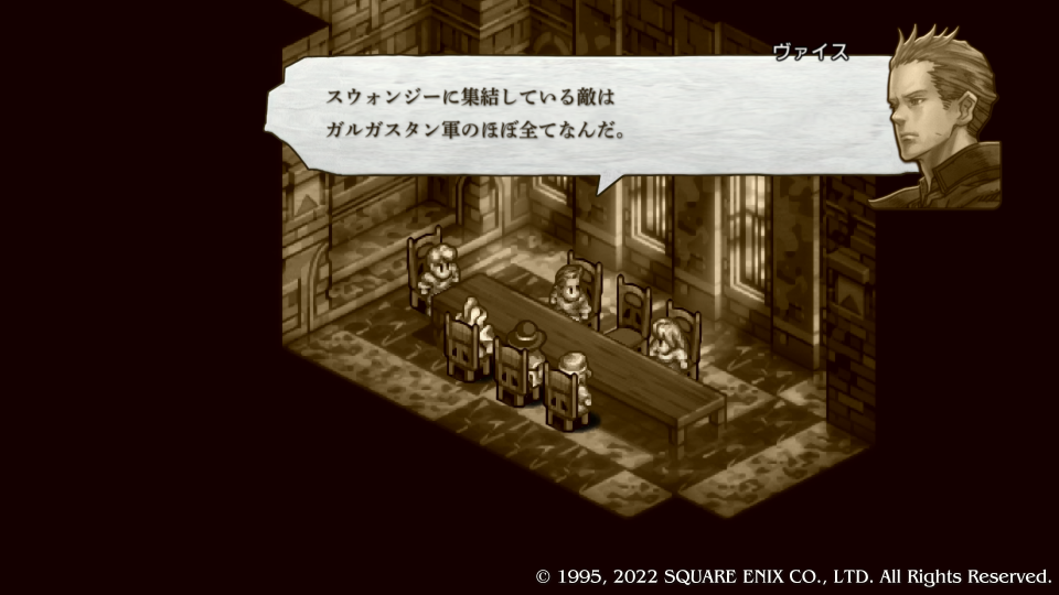 ヴァイス含むネオ・ウォルスタ勢力も軍議に参加して話し合う、なぜかネオの下っ端はめちゃくちゃ感じが悪い、部屋から叩き出してやりたいがそれでは公爵おじさんの再来になってしまうので虚無モードで嫌味は無視して話を聞く。ヴォルテールとかサラを座らせてもいいのにと思ったが忙しいのだろう、きっとそうだ。ヴァイスはガルガスタン軍がスウォンジーにほぼ全軍を集結させている今しか枢機卿を叩くチャンスは無いという、たしかに圧倒的数的不利の戦力差を解消するには少数精鋭で敵の頭を叩くしかない。