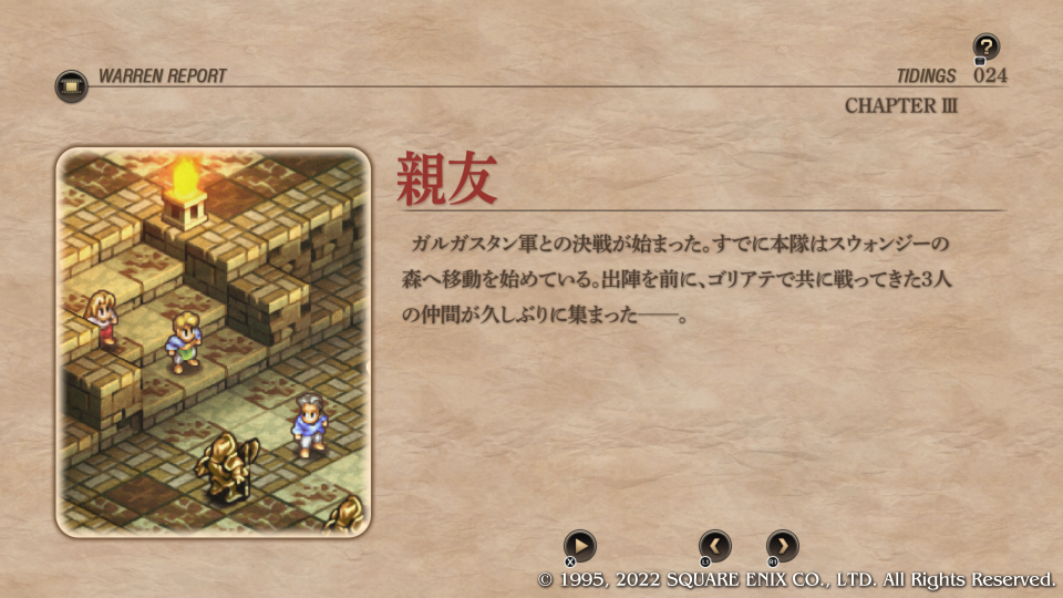最愛の姉さんを置き去りにしてしまったデニム君の闘いがはじまる、とその前にウォーレンレポートの時事内でヴァイスの出立を見ることができる。第三章開始プロローグも終わったので次回は諸々確認からはじめて編成増強してからブリガンテス城、ではなくてフランパ大森林へGOする。