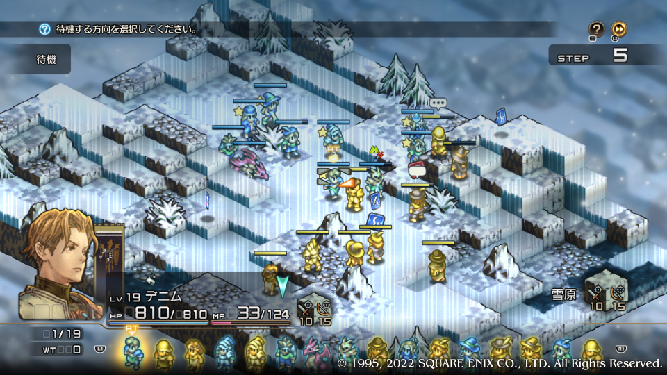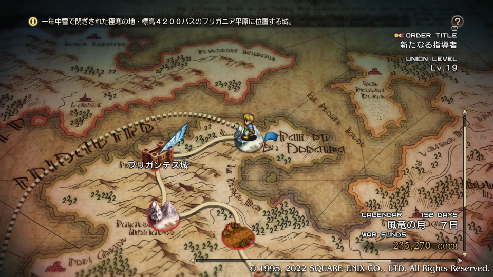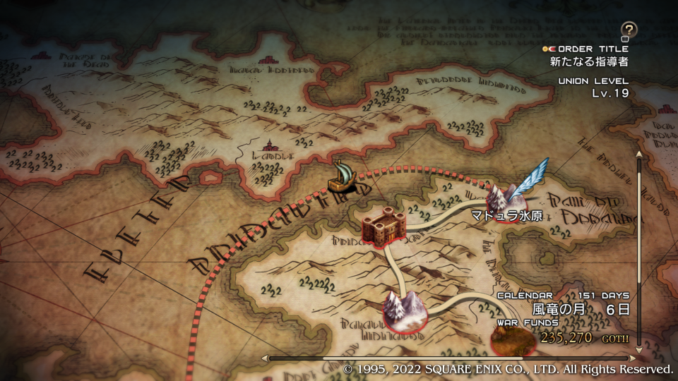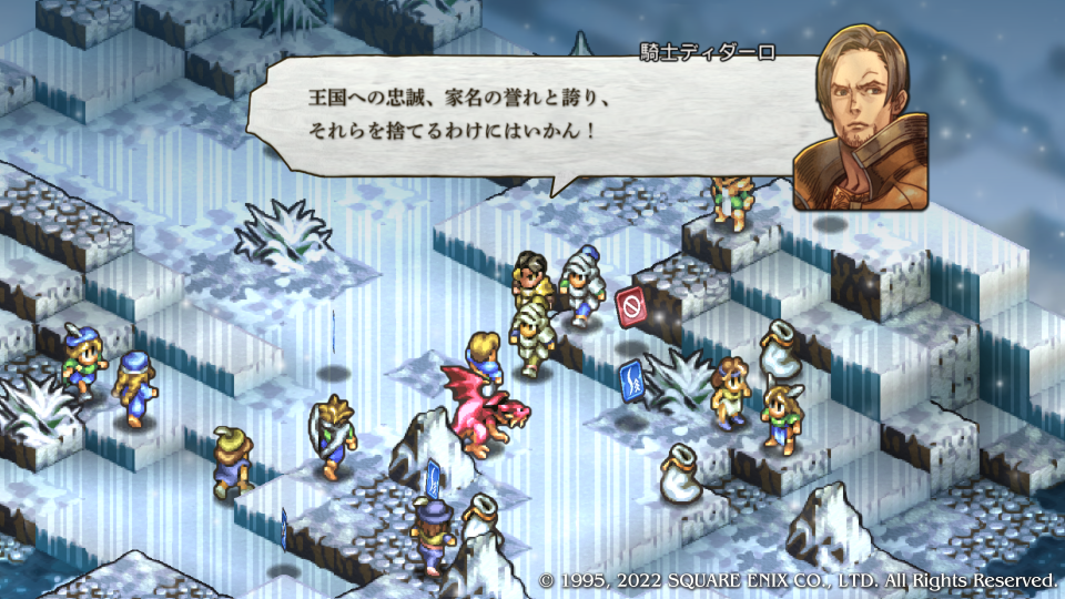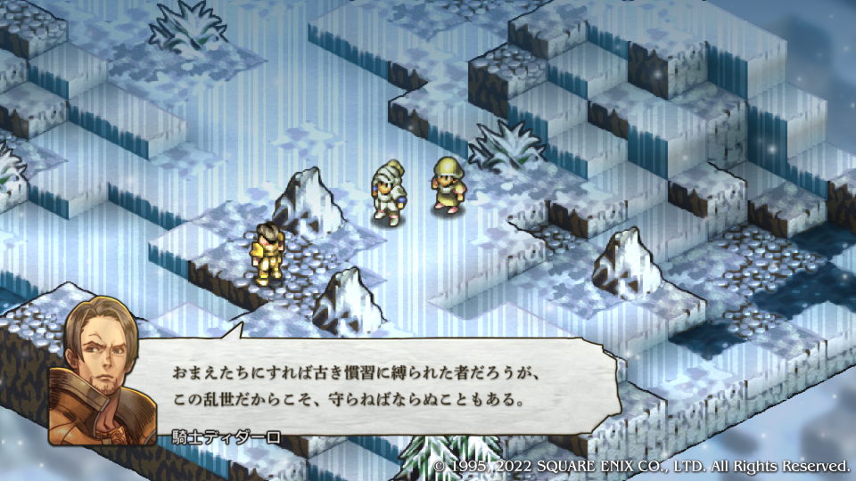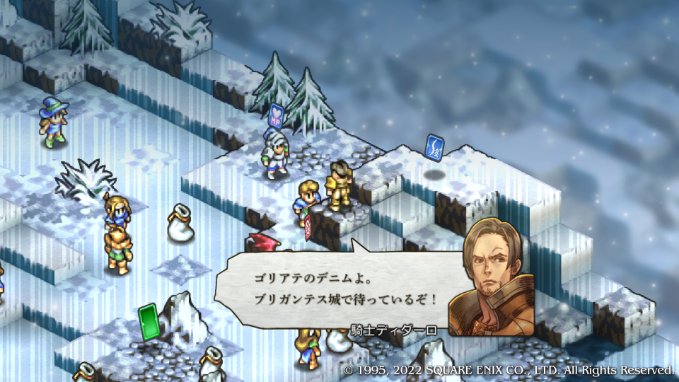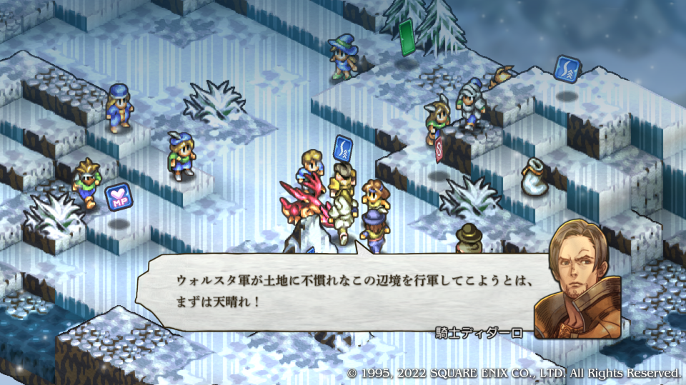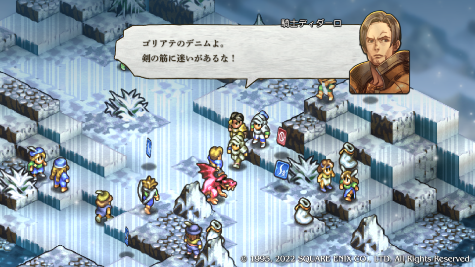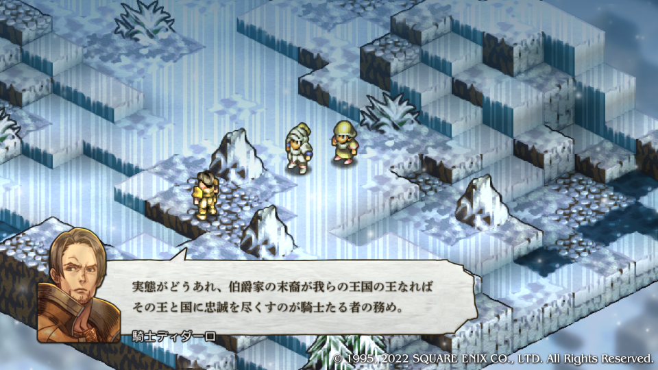 いきなり褒められた嬉しい。ディダーロはルートによってその扱いが全然違う特殊な敵キャラクターだ、どのルートでも死亡からは逃れられないが顔グラが変わったのも納得するほどの優秀な騎士キャラとしてチャプター内の真実(主にガルガスタンの内情)を垣間見せたり、物語の状況を加速させる歯車のような役割をする。今回はマドュラ氷原にウォルスタ軍が現れたことでデニム達の作戦を見抜き、コリタニ城には連絡させなかった、その理由はガルガスタンの内情を憂いているからだ。このマップでは主への忠義と名家の誇りを示す。