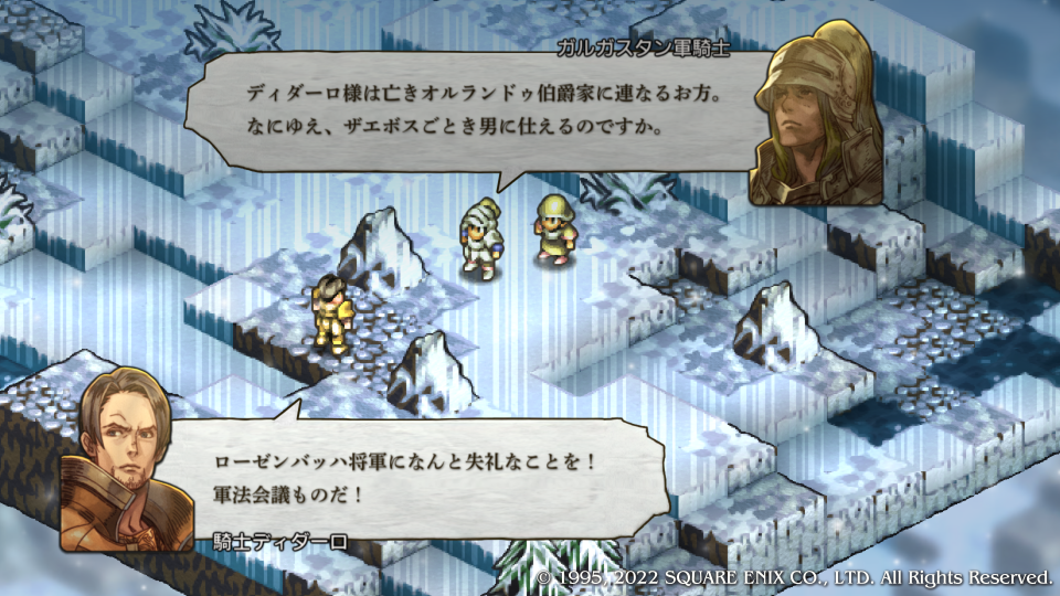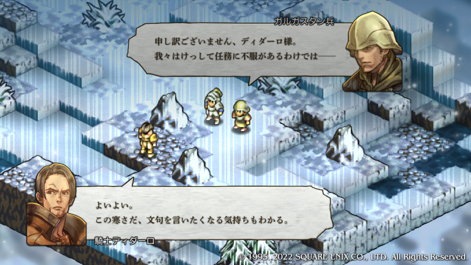 上司の名は『ヘクター・ディダーロ』、今回から顔グラフィックが特別扱いになっている。グアチャロ将軍と同じ扱いのガルガスタン騎士キャラ。それ以上部下を怒ることはせず、現状を受け止め、これまでの歴史を説明して、その上でどうなのか教え諭そうとしている、シンプルこの2人がうらやましい。うちの会社ではこんな上司は一人もいない。