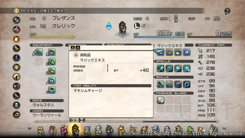 突入前に一度編成を再確認と思ったがユニオンレベルが19からもう長いこと全く上がらないので特に何もなかった、なんとなくクレリックにクリアランスとか付けてみたりマジックエキスを持たせたりしてみた。今回はキュアエキス(マキシムチャージ)がすぐに作れたので回復面では完全にアイテムに越されてしまっているクレリックだが生きる道はいくらでもある、そうクイックムーヴをかけまくればいい。ちょっと育成面ではいろいろ止まってしまうが現時点では素晴らしい活躍をしてくれる運用。だいたい回復魔法の威力がほぼ固定でINTに依存していないようなのでぶっちゃげ棍も持たせなくていいのでは?クレリックの運用についてはスキルが出揃ってから改めて考えよう。それではこれくらいにして突入。