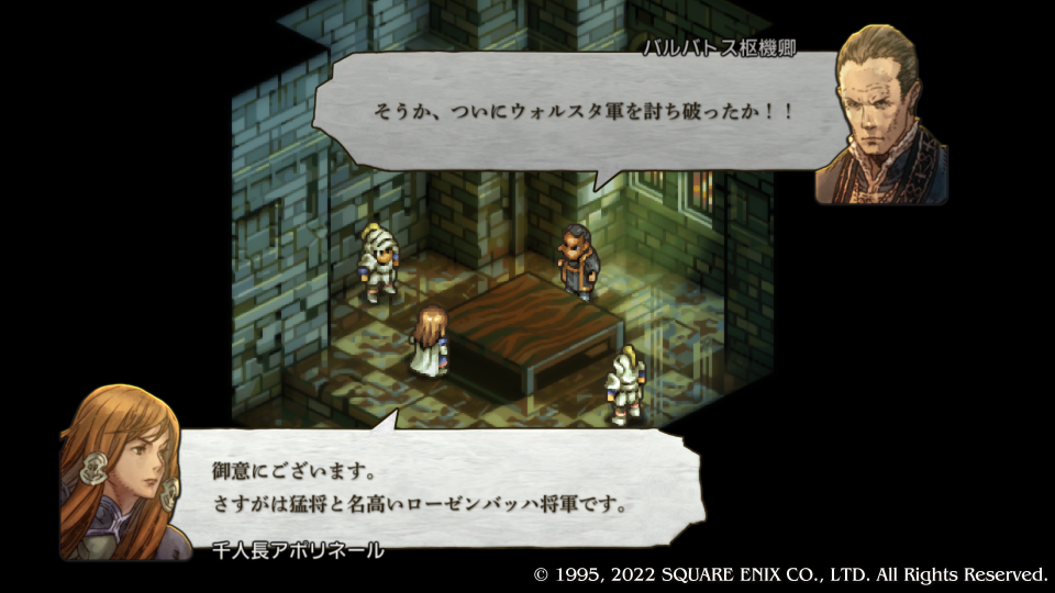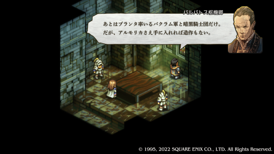 鬼(デニム)が城門前に迫っている中、ガルガスタン陣営はスウォンジーでの勝利の報に沸いていた。バルバトスはやはりバクラムと暗黒騎士団をなんとかしてヴァレリア全土を手中に収めるつもりのようだ。ほんと強欲な人間だ、これだけ激しくポジションを取っていれば反体制派ができて当然だろう。