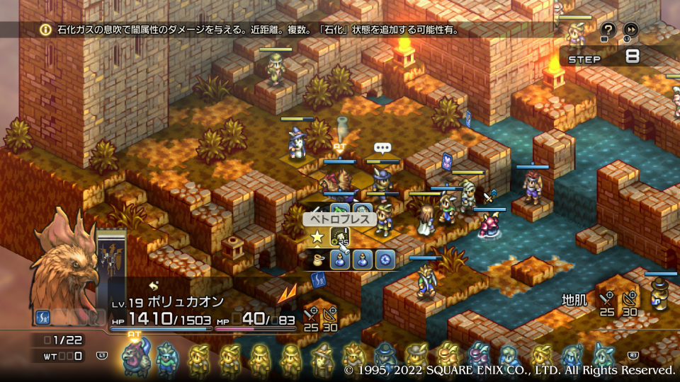 思ったより敵が強くなかったのでバンバン進む、うちのグリフォンとコカトリスがあまり狙われないのでマキシマイズもかかって暴れまくり。カノープスに弓などを装備させて複数範囲攻撃を持つウィザードを手早く落とした方がよい。城の入口に向かったのはデニム・ヴォルテール・マチルダさん(ニンジャ)だが手余りになりそうなくらい直線ドリブルできている。