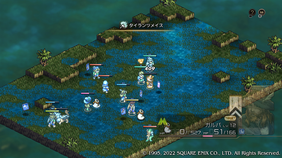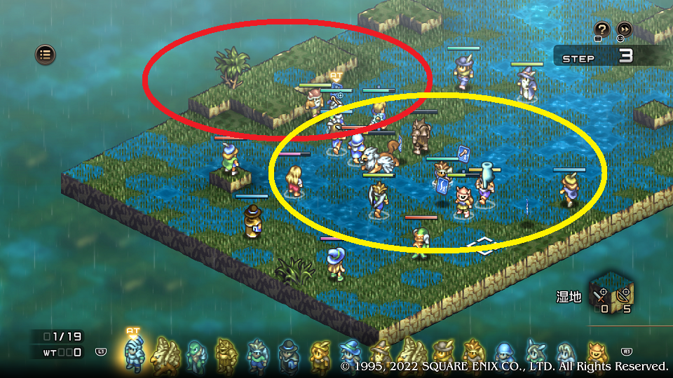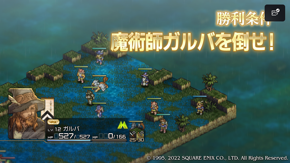 今回は正面衝突でも充分勝てるが、スーファミ版では毎回すごいシビアな戦闘になっていたので少しでも地形効果が良い方へ、そしてなるべく時間差でユニット同士が当たるように左に大きく部隊を振って弓で削りながら足が速く到着したユニットから叩いたりしていた。前がどうだったかあまり覚えていないがダメージがソフトなので回復さえ気を付けていれば誰も落とされることなく戦える。ホークマンがビーストテイマーなので調教勧誘もしやすい、テラーナイトの袋は転職証が入っているはずなので拾われないように気を付ける。
