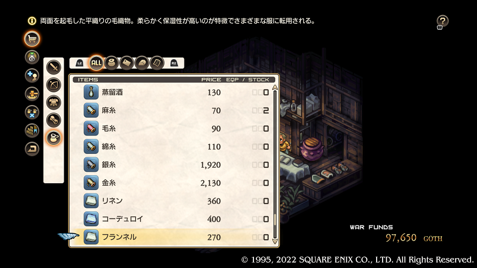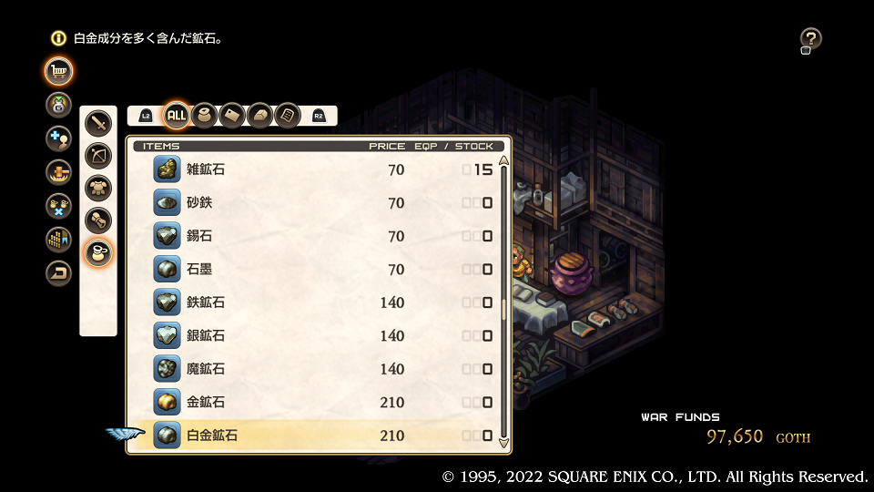 まあ前回もハマっていたので苦行だろうがなんだろうが耐えきったが。今回は合成結果が確率ではなくなったのでセーブ&ロードで何時間も費やすことはないんだろう、最高じゃないか。それでは様子を見てみる、まずはショップでレシピを買うんだったな。最初は素材も持ってないし、そんなにできないんだろう。とオレは思っていた。
